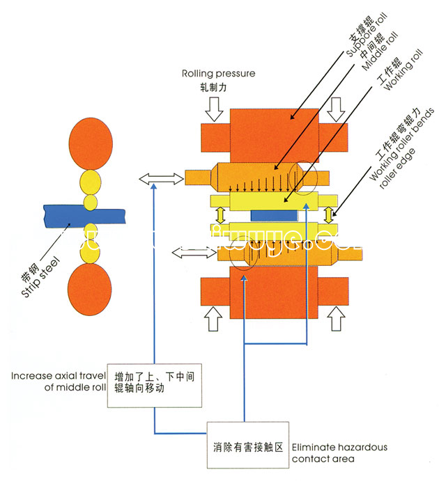 ![]() 用途及特點(diǎn)1、適用于普碳鋼、不銹鋼、特種鋼等帶材軋制。特別適合軋制高精度寬帶、薄帶。2、具有液壓彎輥裝置和中間輥橫移裝置,能迅速調(diào)整軋輥的凸度,改變軋輥間接觸壓力分布,消除了軋輥間的有害接觸區(qū),達(dá)到控制板形和板凸度的目的。 3、成品板型平整、穩(wěn)定、可控、有效改善帶鋼邊部減薄和邊裂現(xiàn)象;可配置更小的工作輥徑,增加道次壓下量和軋程總壓下量;工作輥可使用平輥型,減少軋輥的備品量和消耗。 4、AGC六輥HC軋機(jī)控制精度高,尤其適合于高精度寬帶,薄帶的軋制。 生產(chǎn)線工藝流程開卷機(jī)(上卷小車)→開頭矯直機(jī)→ 前卷取機(jī)→(卸卷小車)→機(jī)前裝置→六輥主機(jī)→機(jī)后裝置→后卷取機(jī)(卸卷小車)→(助卷機(jī))