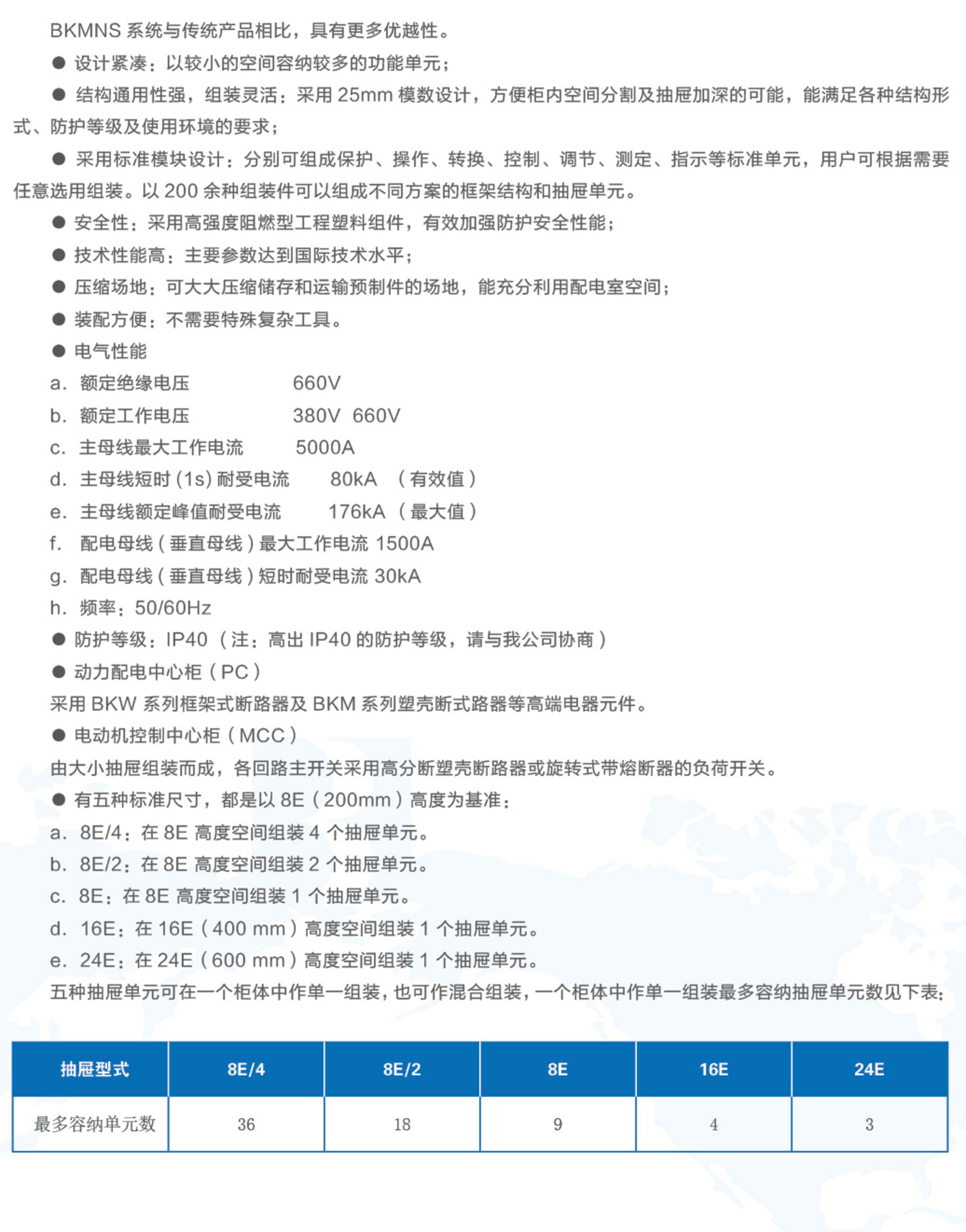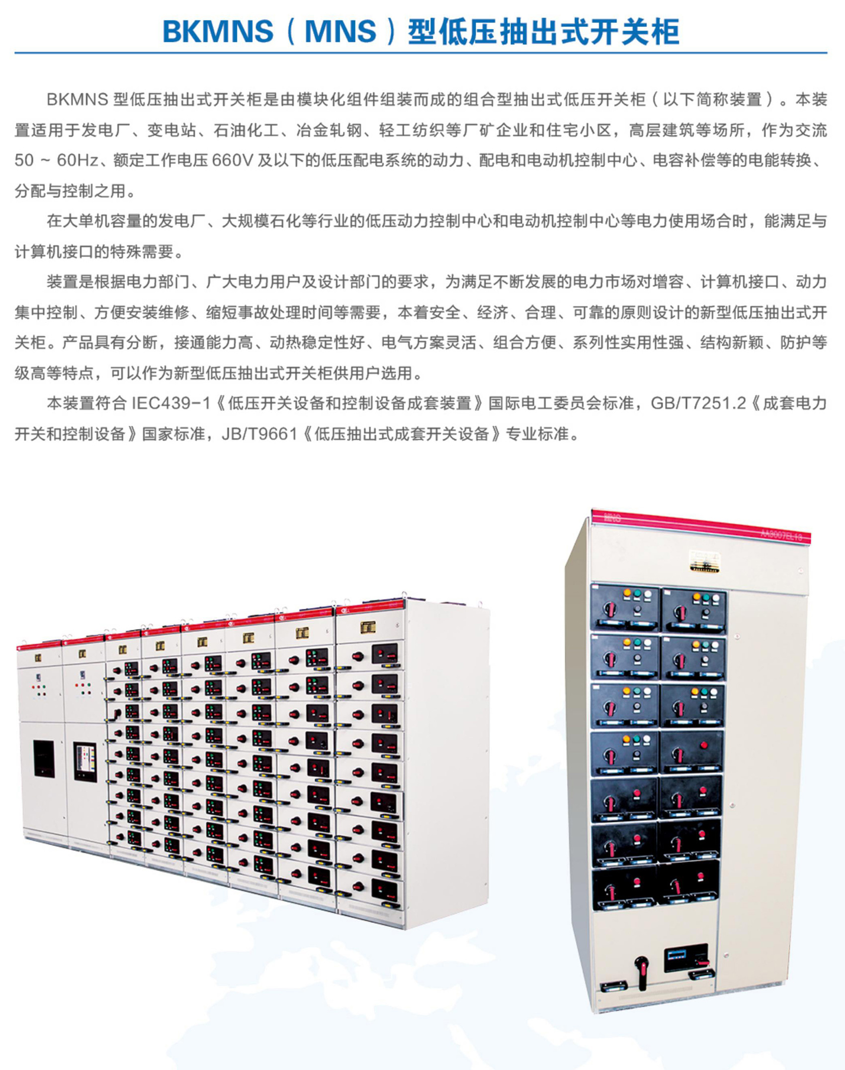 BKMNS 型低壓抽出式開(kāi)關(guān)柜是由模塊化組件組裝而成的組合型抽出式低壓開(kāi)關(guān)柜(以下簡(jiǎn)稱裝置)。本裝置適用于發(fā)電廠、變電站、石油化工、冶金軋鋼、輕工紡織等廠礦企業(yè)和住宅小區(qū),高層建筑等場(chǎng)所,作為交流50~60Hz、額定工作電壓660V及以下的低壓配電系統(tǒng)的動(dòng)力、配電和電動(dòng)機(jī)控制中心、電容補(bǔ)償?shù)鹊碾娔苻D(zhuǎn)換、分配與控制之用。在大單機(jī)容量的發(fā)電廠、大規(guī)模石化等行業(yè)的低壓動(dòng)力控制中心和電動(dòng)機(jī)控制中心等電力使用場(chǎng)合時(shí),能滿足與計(jì)算機(jī)接口的特殊需要。裝置是根據(jù)電力部門、廣大電力用戶及設(shè)計(jì)部門的要求,為滿足不斷發(fā)展的電力市場(chǎng)對(duì)增容、計(jì)算機(jī)接口、動(dòng)力集中控制、方便安裝維修、縮短事故處理時(shí)間等需要,本著安全、經(jīng)濟(jì)、合理、可靠的原則設(shè)計(jì)的新型低壓抽出式開(kāi)關(guān)柜。產(chǎn)品具有分?jǐn)?,接通能力高、?dòng)熱穩(wěn)定性好、電氣方案靈活、組合方便、系列性實(shí)用性強(qiáng)、結(jié)構(gòu)新穎、防護(hù)等級(jí)高等特點(diǎn),可以作為新型低壓抽出式開(kāi)關(guān)柜供用戶選用。