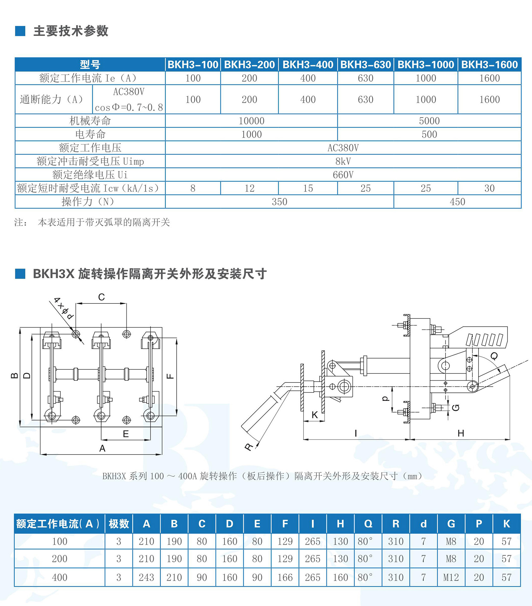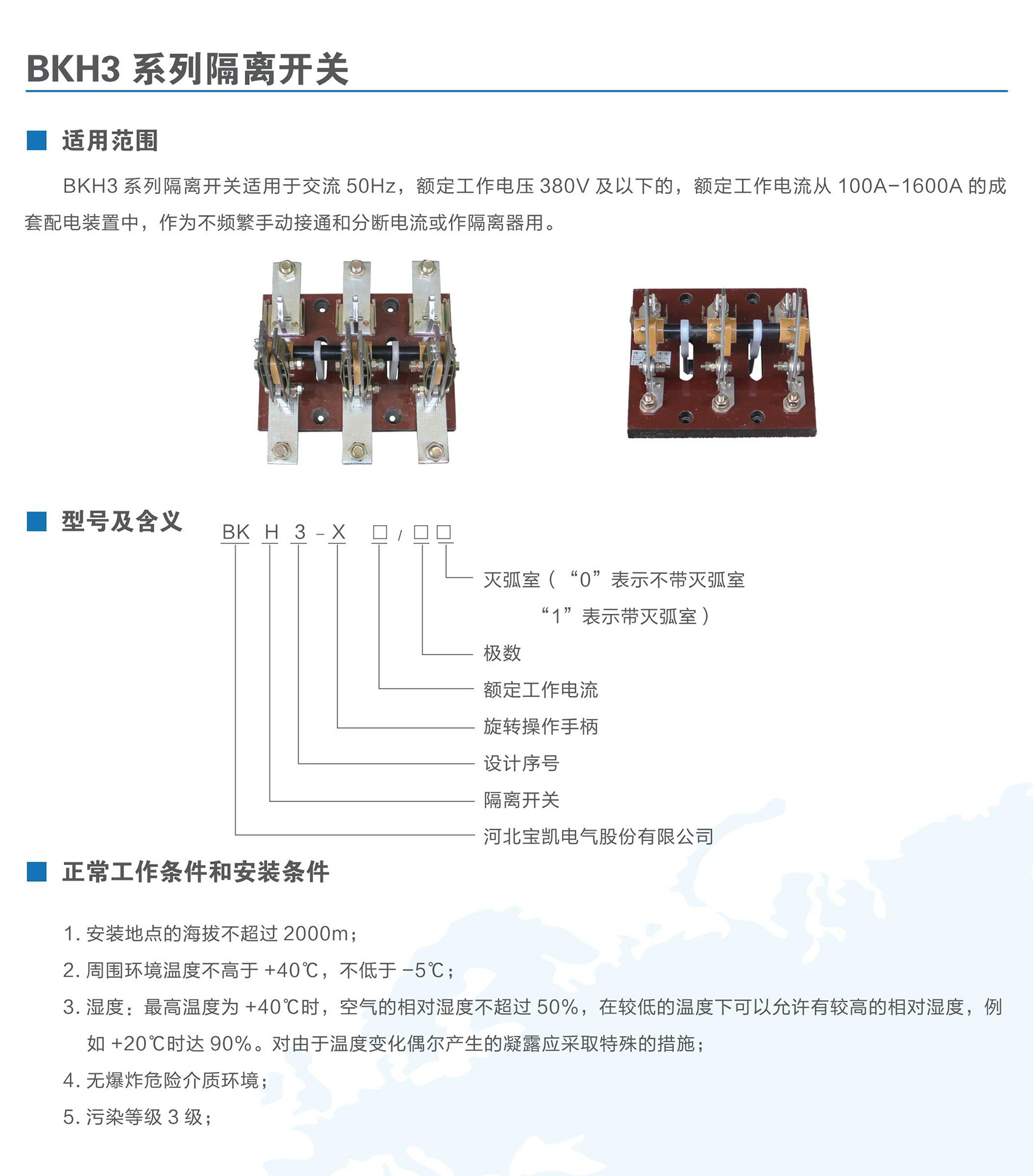 BKH3系列隔離開關(guān)適用于交流50Hz,額定工作電壓380V及以下,額定工作電流100A-1600A的成套配電裝置中,作為不頻繁手動接通和分斷電流或作隔離器用。BKH3系列隔離開關(guān)符合GB/T 14048.3《低壓開關(guān)設(shè)備和控制設(shè)備低壓開關(guān)、隔離器、隔離開關(guān)及熔斷器組合電器》。