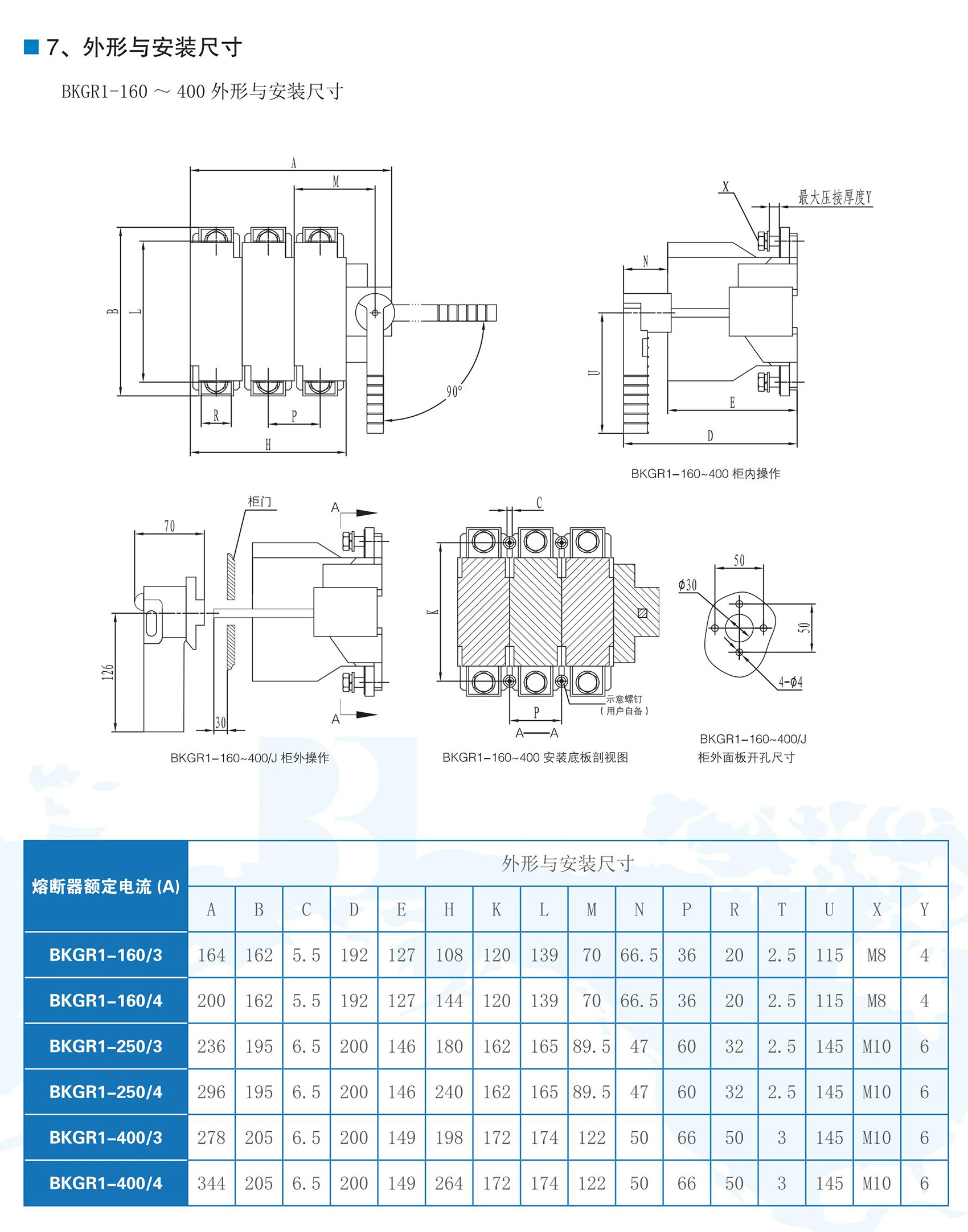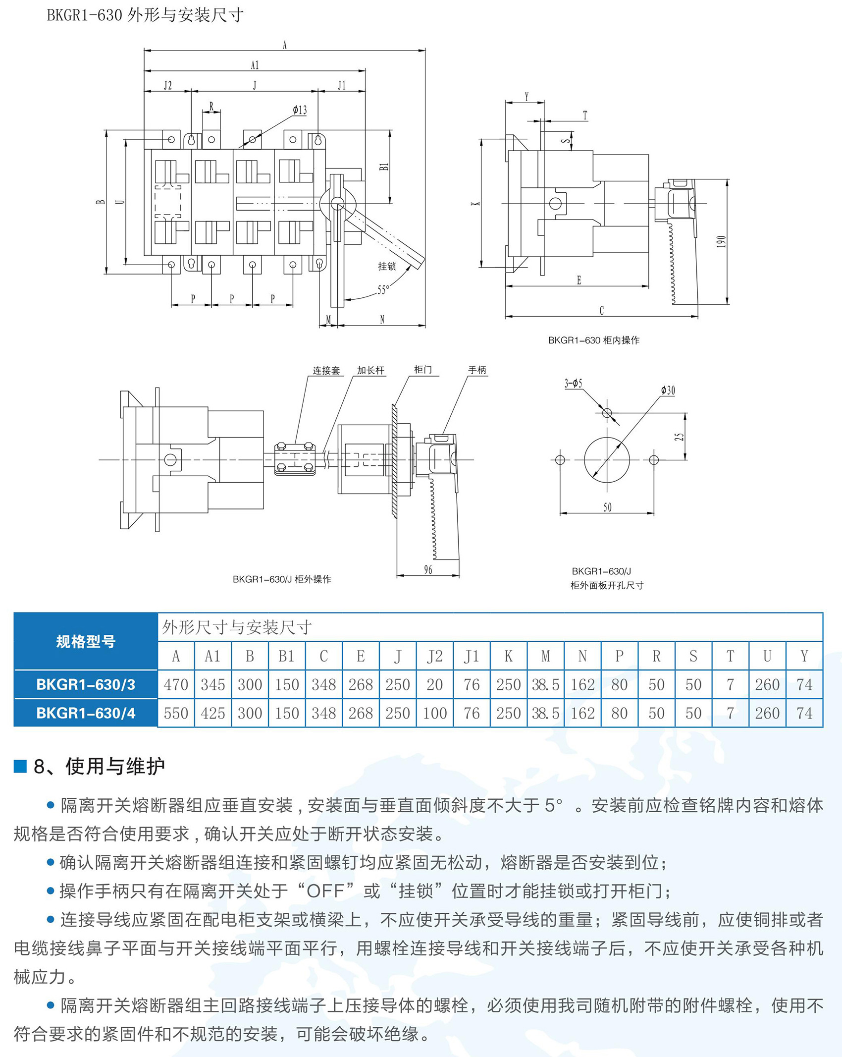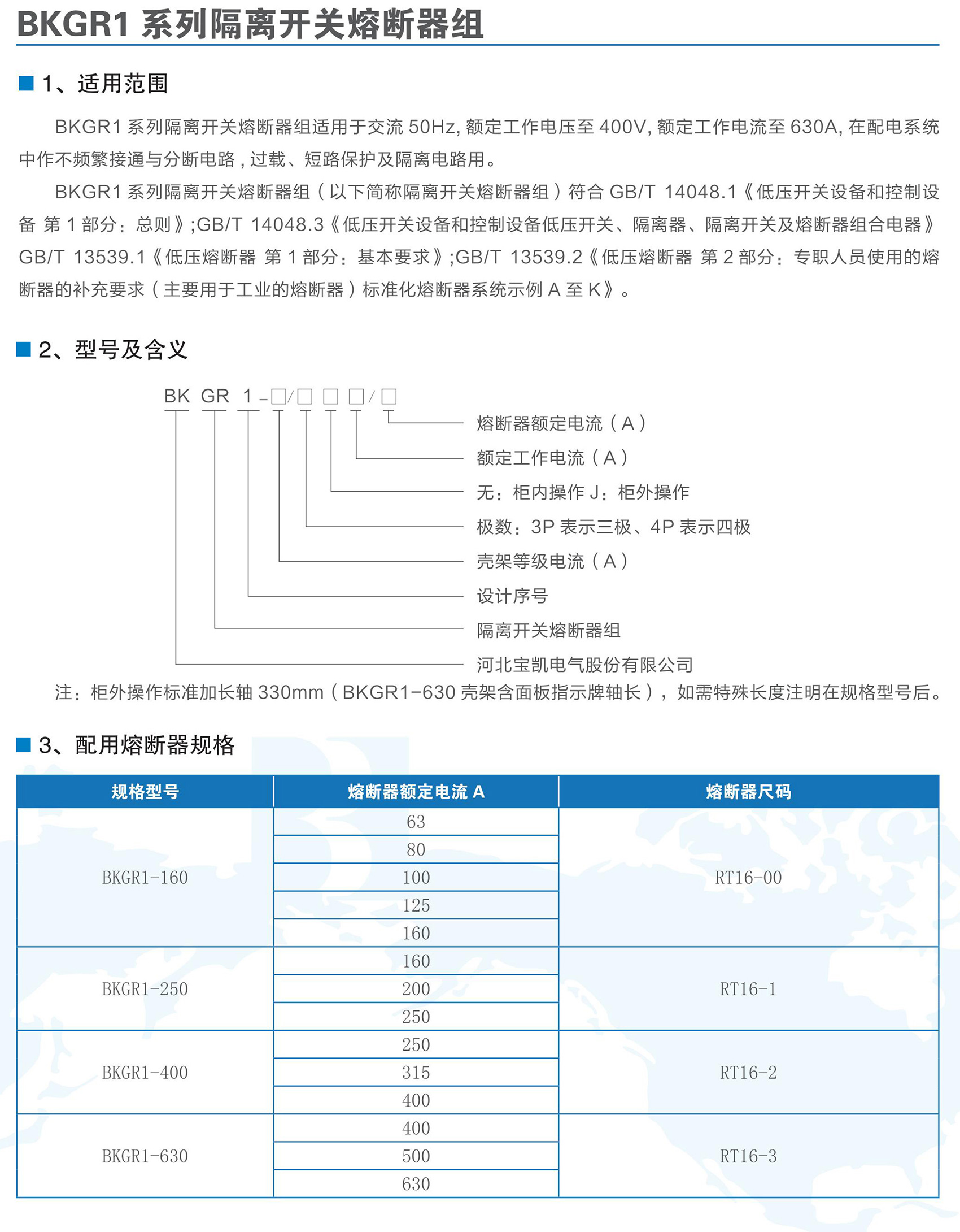BKGR1系列隔離開關熔斷器組適用于交流50Hz,額定工作電壓為AC400V,額定工作電流63A-630A的低壓配電或電動機網(wǎng)絡中,作為不頻繁接通、分斷電路及線路的隔離之用??商峁┒搪?、過載保護功能。BKGR1系列隔離開關熔斷器組符合GB/T 14048.3《低壓開關設備和控制設備低壓開關、隔離器、隔離開關及熔斷器組合電器》。