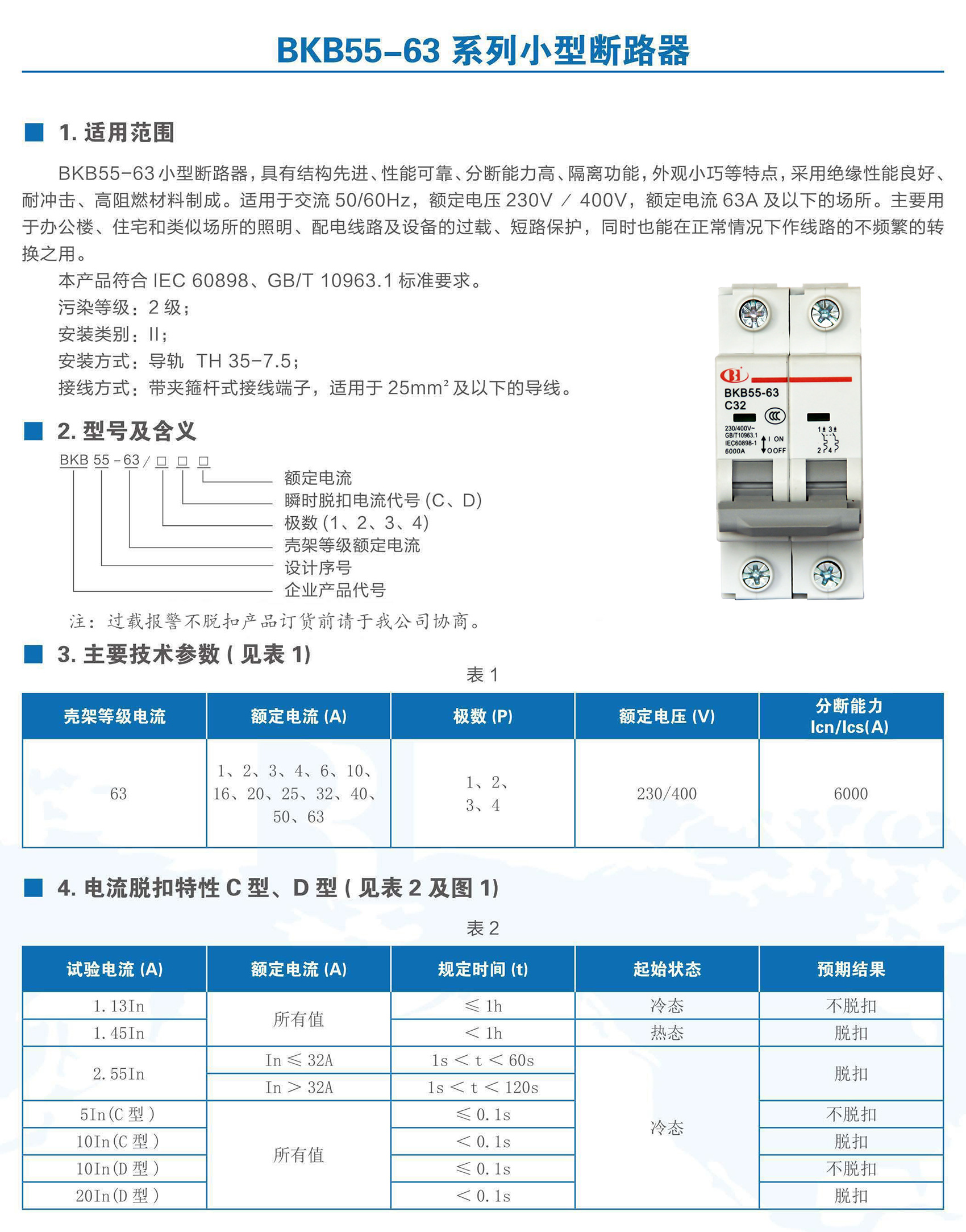 BKB55-63系列小型斷路器適用于交流50/60Hz,額定電壓至400V,額定電流1~63A,額定絕緣電壓500V的系統(tǒng)線路中。用來對建筑電廠、變電站、電信、交通、冶金、工礦業(yè)等及類似場所的系統(tǒng)線路、電氣設備進行過電流保護,也可以用于不頻繁的通斷操作。適用于非專業(yè)人員使用且不需要進行維護。本產(chǎn)品符合GB/T 10963.1、IEC 60898-1標準。
