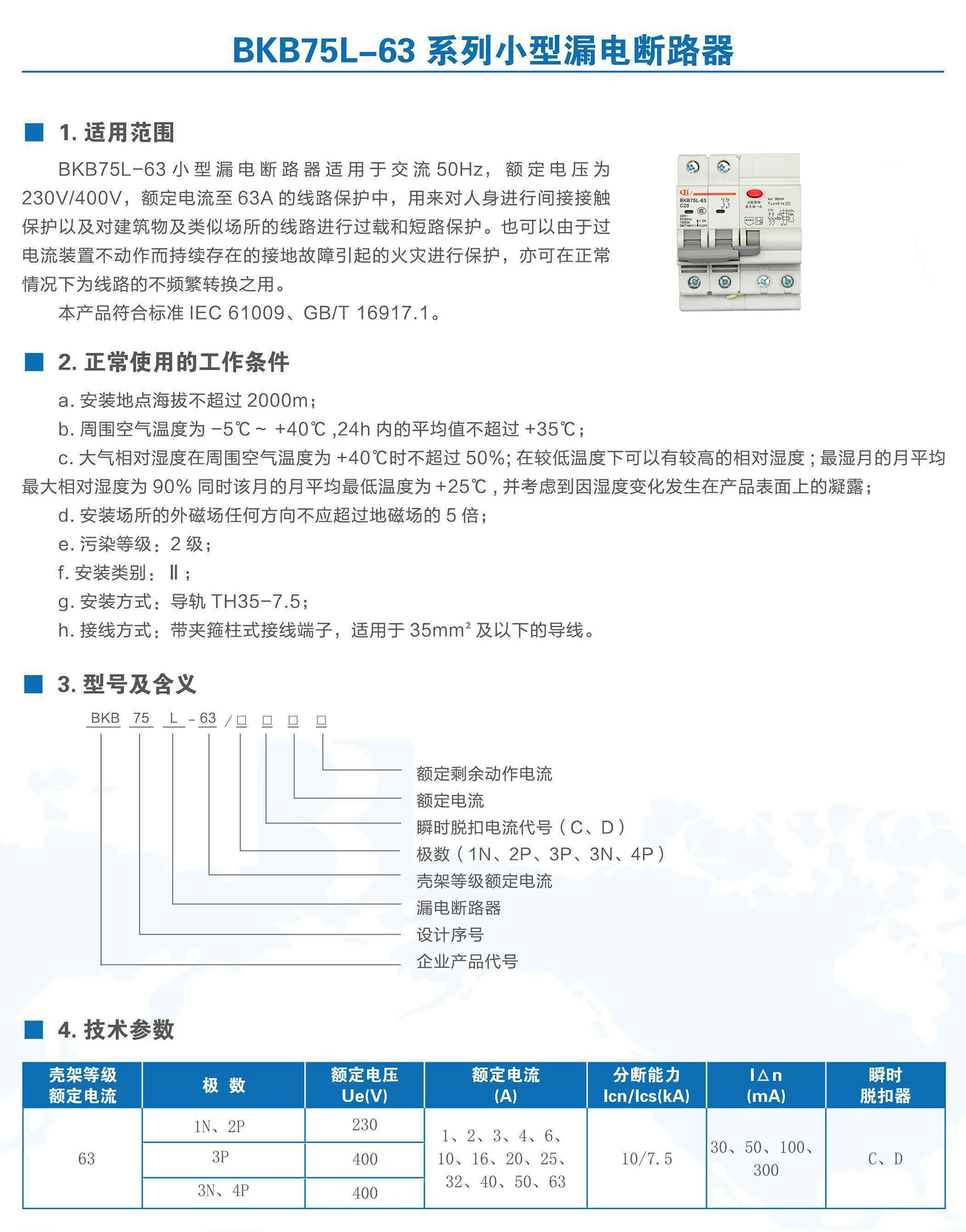 BKB75L-63系列帶剩余電流保護小型斷路器適用于交流50/60Hz、額定電壓至400V,額定電流1~63A 的線路中。作為人身觸電和設備漏電保護之用,并可用于線路和電氣設備的過載以及短路保護。在正常情況下亦可用于不頻繁的通斷操作。本產(chǎn)品符合GB/T 16917.1、IEC 61009-1標準。