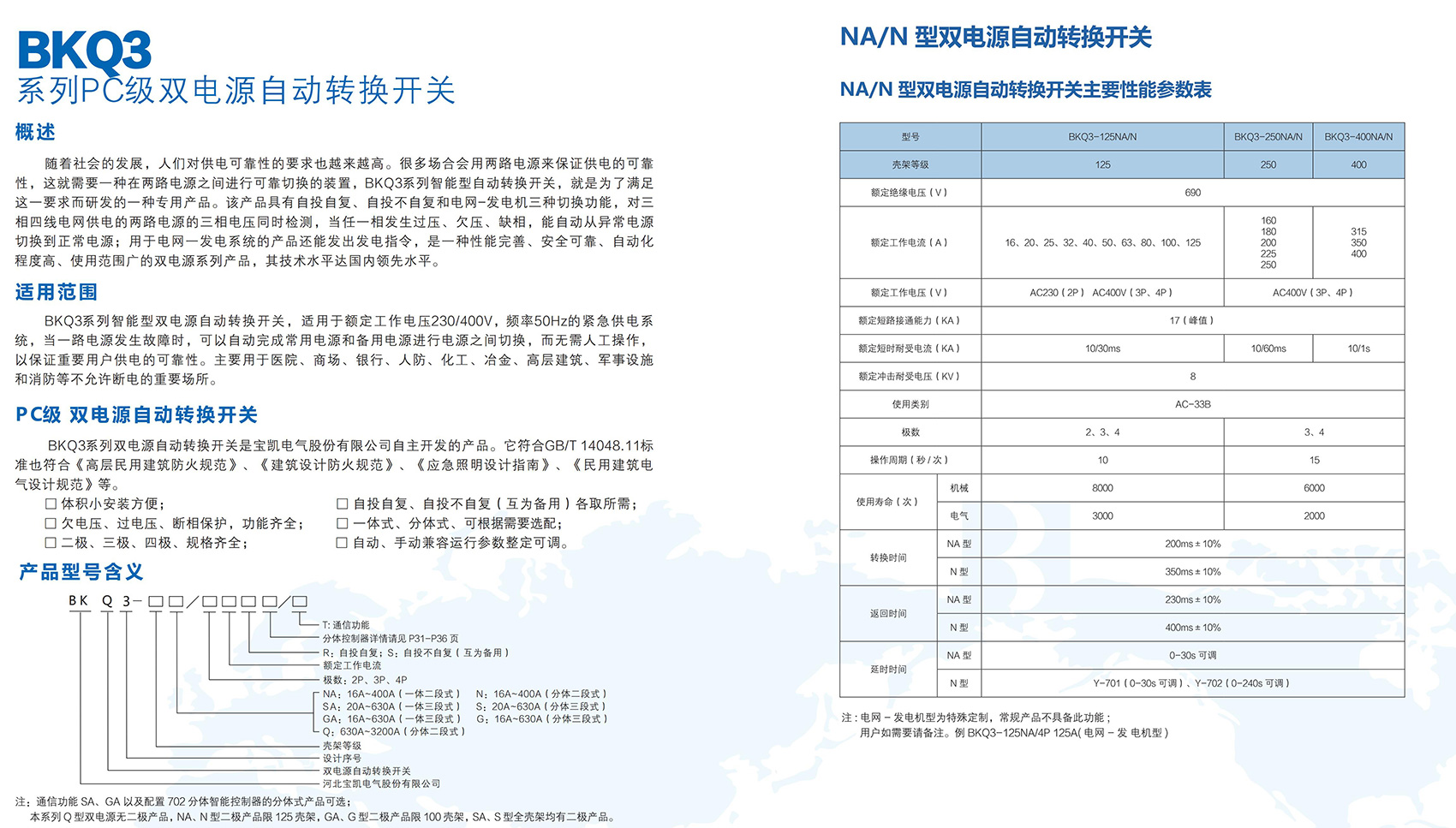 BKQ3-3200Q系列自動轉(zhuǎn)換開關(guān)電器適用于交流50/60Hz,額定工作電壓400V,額定電流800A至3200A的雙路配電系統(tǒng)中,產(chǎn)品由開關(guān)本體與轉(zhuǎn)換控制器兩部分組成,本體采用電磁線圈驅(qū)動,轉(zhuǎn)換速度快;轉(zhuǎn)換控制器具有對兩路三相電源的過電壓、欠電壓、缺相等故障檢測功能;同時帶有發(fā)電機(jī)組啟、停信號輸出。主要應(yīng)用于醫(yī)院、商場、銀行、化工、高層建筑、軍事設(shè)施、消防等不允許斷電的重要場所。產(chǎn)品符合GB/T 14048.11《低壓開關(guān)設(shè)備和控制設(shè)備 第 6-1 部分:多功能電器 轉(zhuǎn)換開關(guān)電器》。