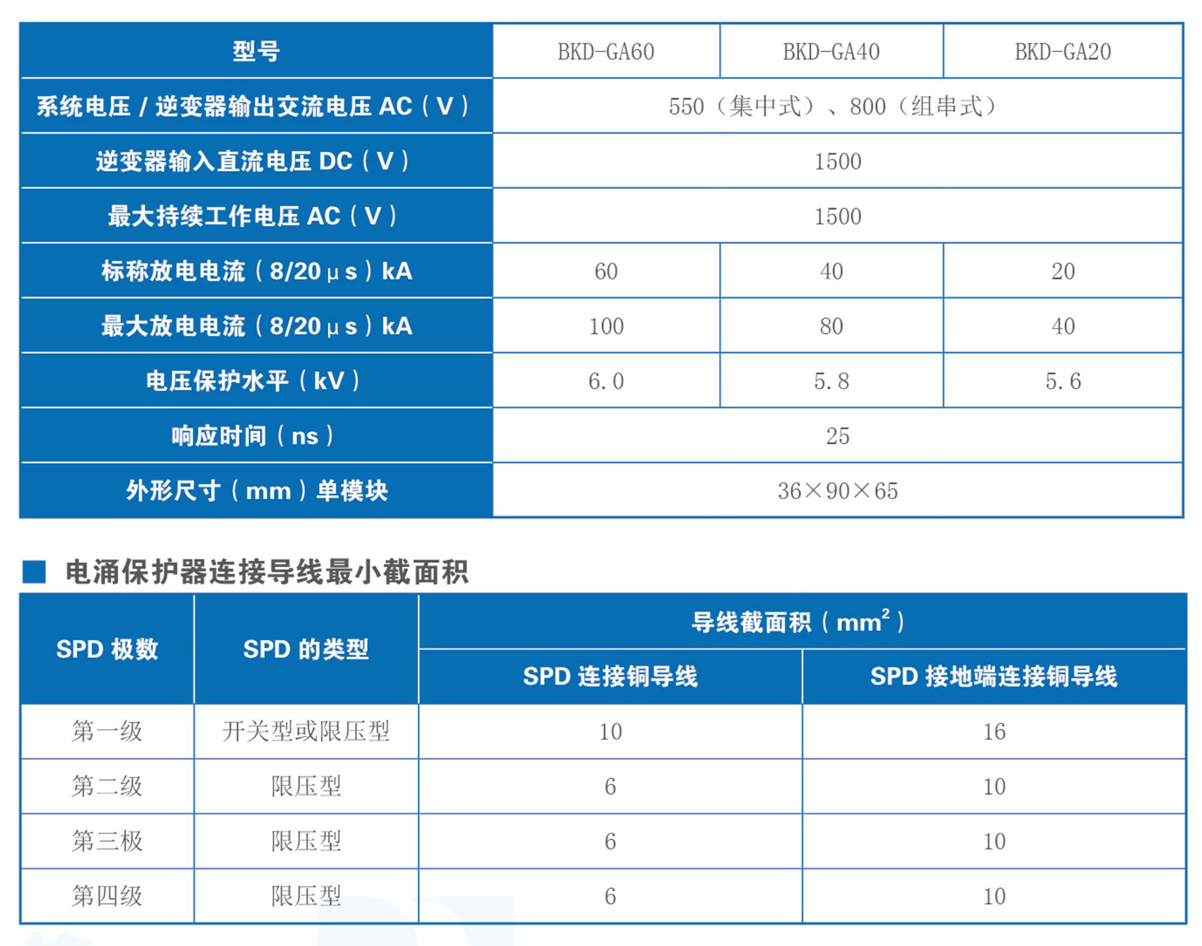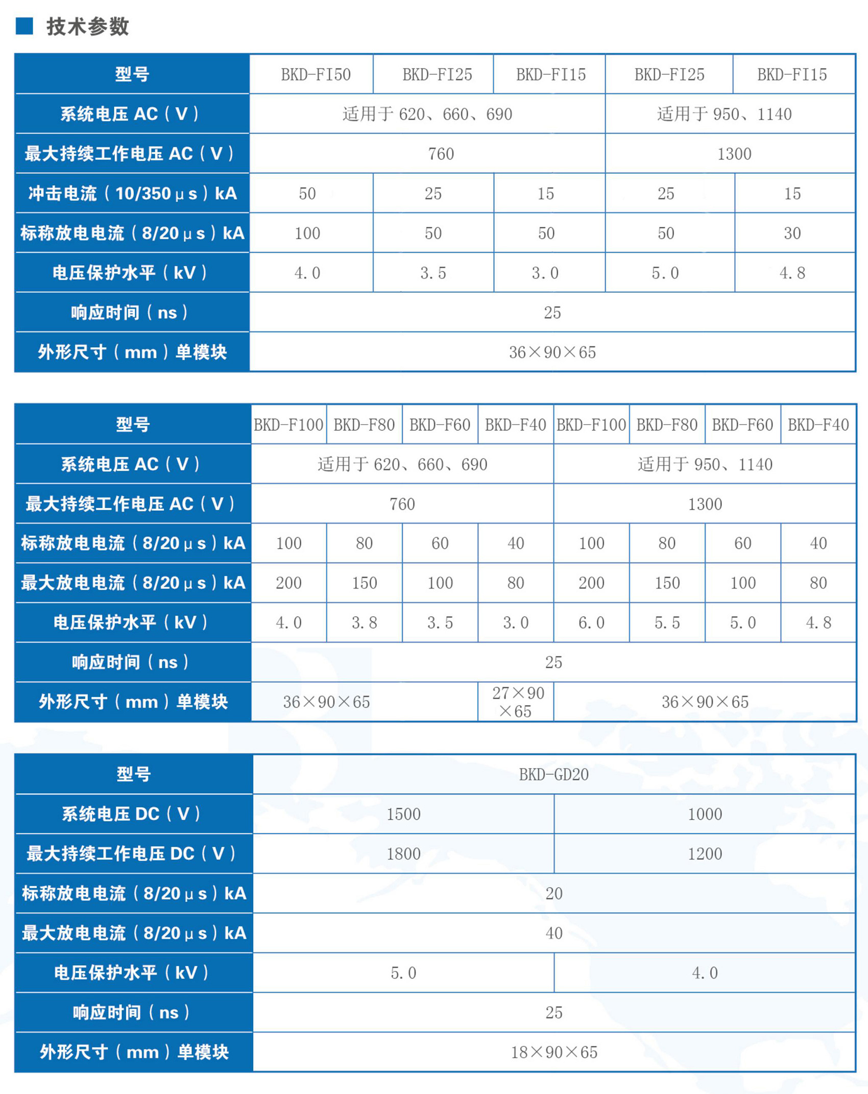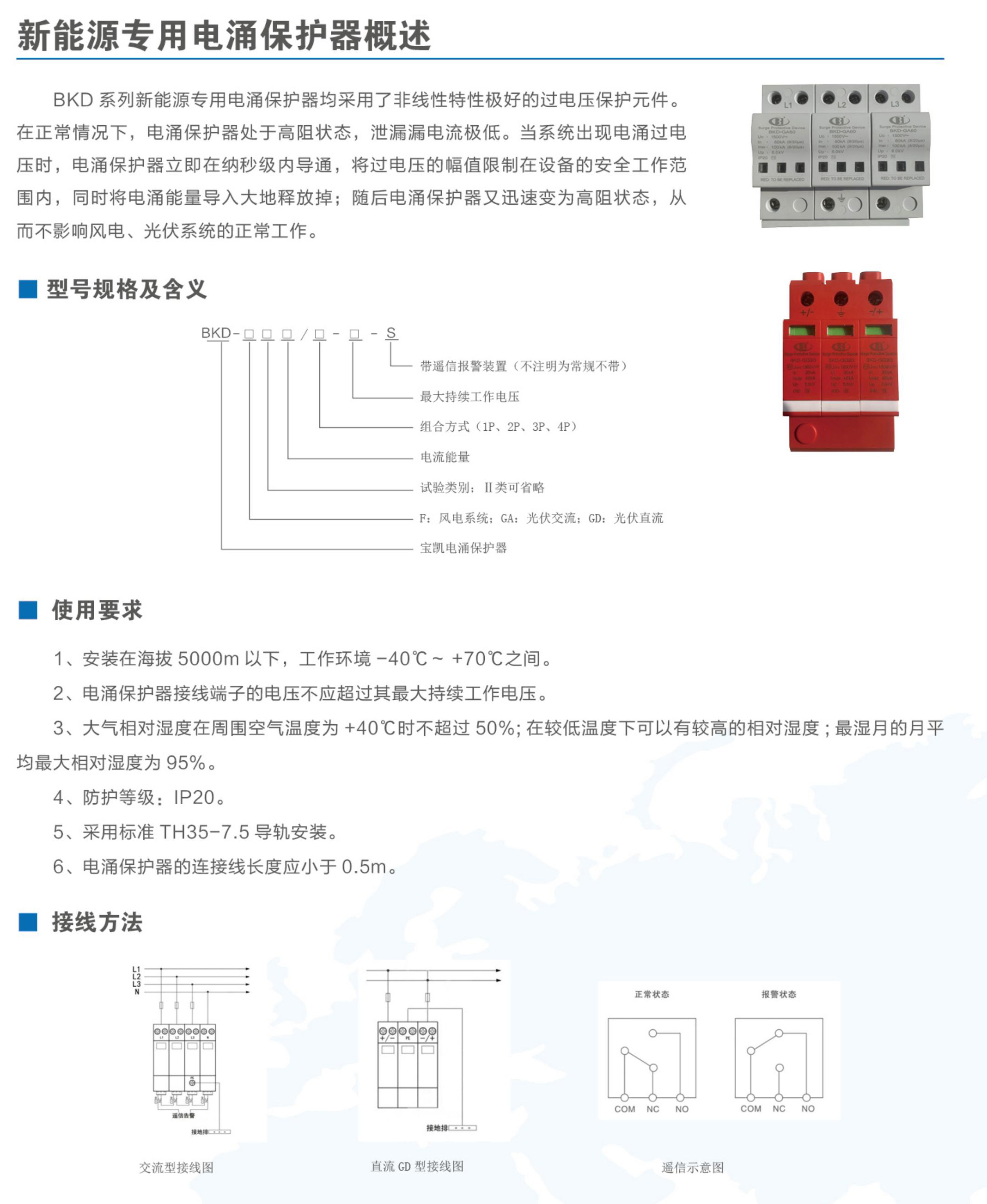 BKD系列新能源專用電涌保護器均采用了非線性特性極好的過電壓保護元件。在正常情況下,電涌保護器處于高阻狀態(tài),泄漏漏電流極低。當系統(tǒng)出現(xiàn)電涌過電壓時,電涌保護器立即在納秒級內(nèi)導通,將過電壓的幅值限制在設備的安全工作范圍內(nèi),同時將電涌能量導入大地釋放掉;隨后電涌保護器又迅速變?yōu)楦咦锠顟B(tài),從而不影響風電、光伏系統(tǒng)的正常工作。產(chǎn)品符合GB/T 18802.11、GB/T 18802.11標準。